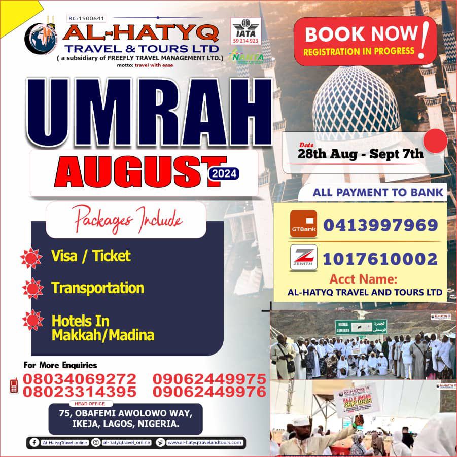 “We have built strong relationships with our partners and suppliers, which enables us to offer competitive prices and packages that meet the needs of our clients. Our goal is to provide a stress-free travel experience, and we are committed to achieving that for every client who travels with us”, Dr Badmus added. To this end, prospective travellers are advised not to miss this opportunity to perform their Umrah in August with Al-Hattiq Travel and Tours. For more information they contact: 080 3406 9272, 090 6244 9975, and +966 54 024 5635, or reach out to them through its social Media: @al_hatyqtravel_online, @walexy_badmus, or visit the firm’s Office Address at 75, Obafemi Awolowo Way, Ikeja, Lagos.